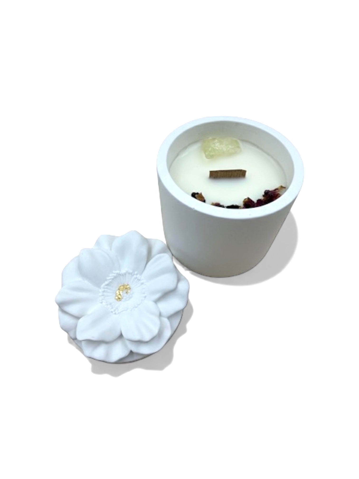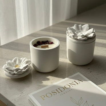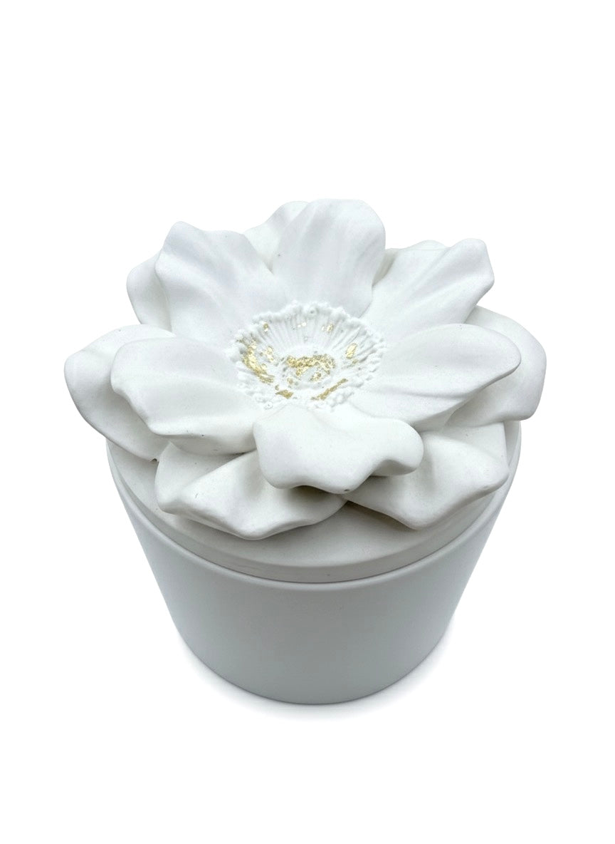 Astra Bloom es una pieza creada para quienes disfrutan de los detalles especiales. Su forma redonda, elaborada a mano con resina ecológica en un delicado color blanco, aporta serenidad y pureza a cualquier espacio. La tapa, inspirada en una flor de magnolia, está trabajada cuidadosamente con detalles en pan de oro que añaden un toque luminoso y sofisticado.