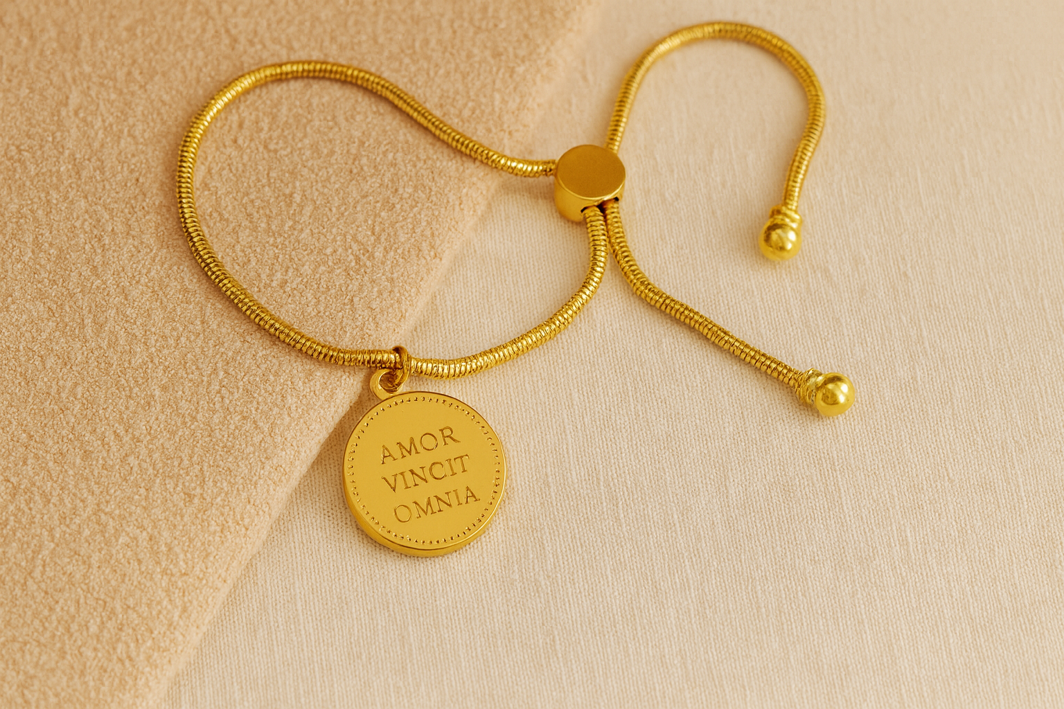 El encanto de esta pulsera contiene la frase "Amor Vincit Omnia", que significa "el amor lo vence todo". Esta frase es un recordatorio de la importancia del amor propio y del amor hacia los demás. En la cultura ibicenca, las puestas de sol en Cala Benirrás son un momento mágico donde la comunidad se reúne para celebrar la vida y el amor, creando una energía única y positiva que llena el aire.