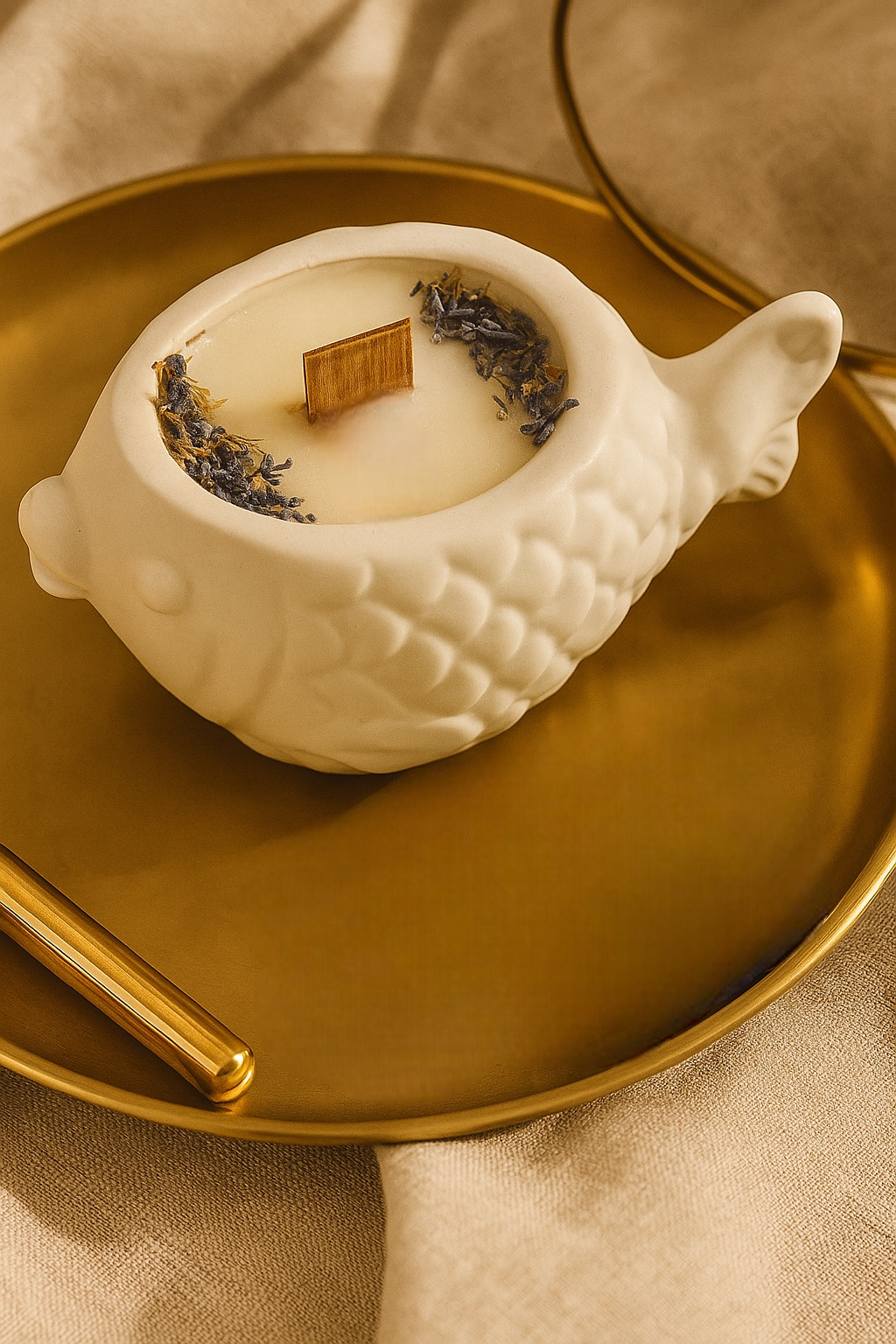 Sumérgete en la frescura del mar con Náyade, nuestra vela escultórica de cera de soja y coco, moldeada completamente a mano en resina ecológica con acabado mate. Su forma inspirada en un pez mediterráneo aporta dinamismo y elegancia, convirtiéndola en una pieza decorativa única y llena de carácter para cualquier espacio.